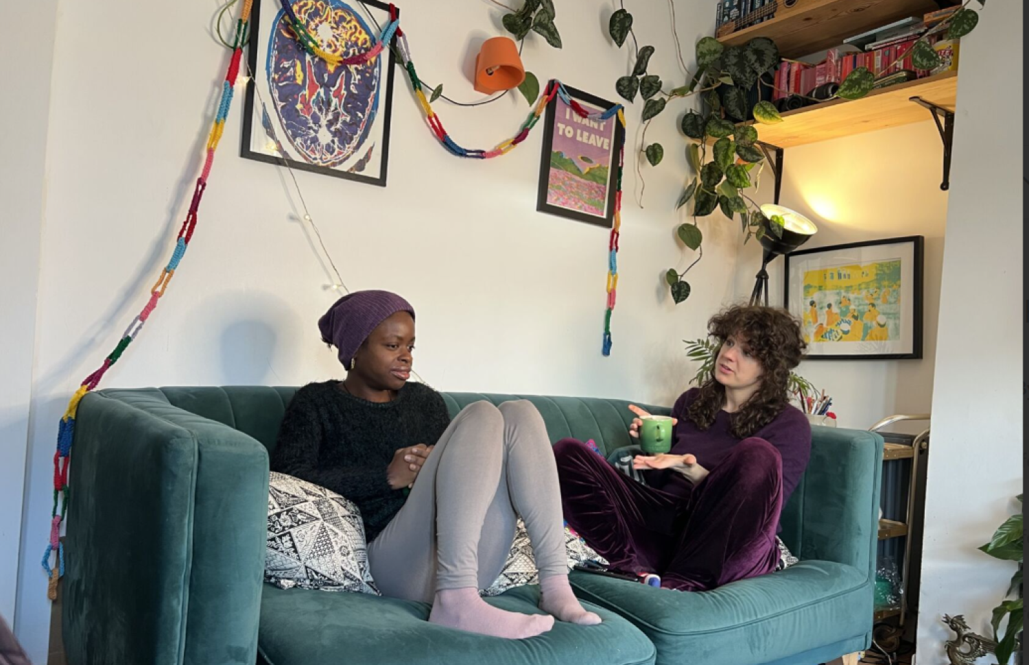 Ashley and a friend sit on a sofa drinking tea and chatting