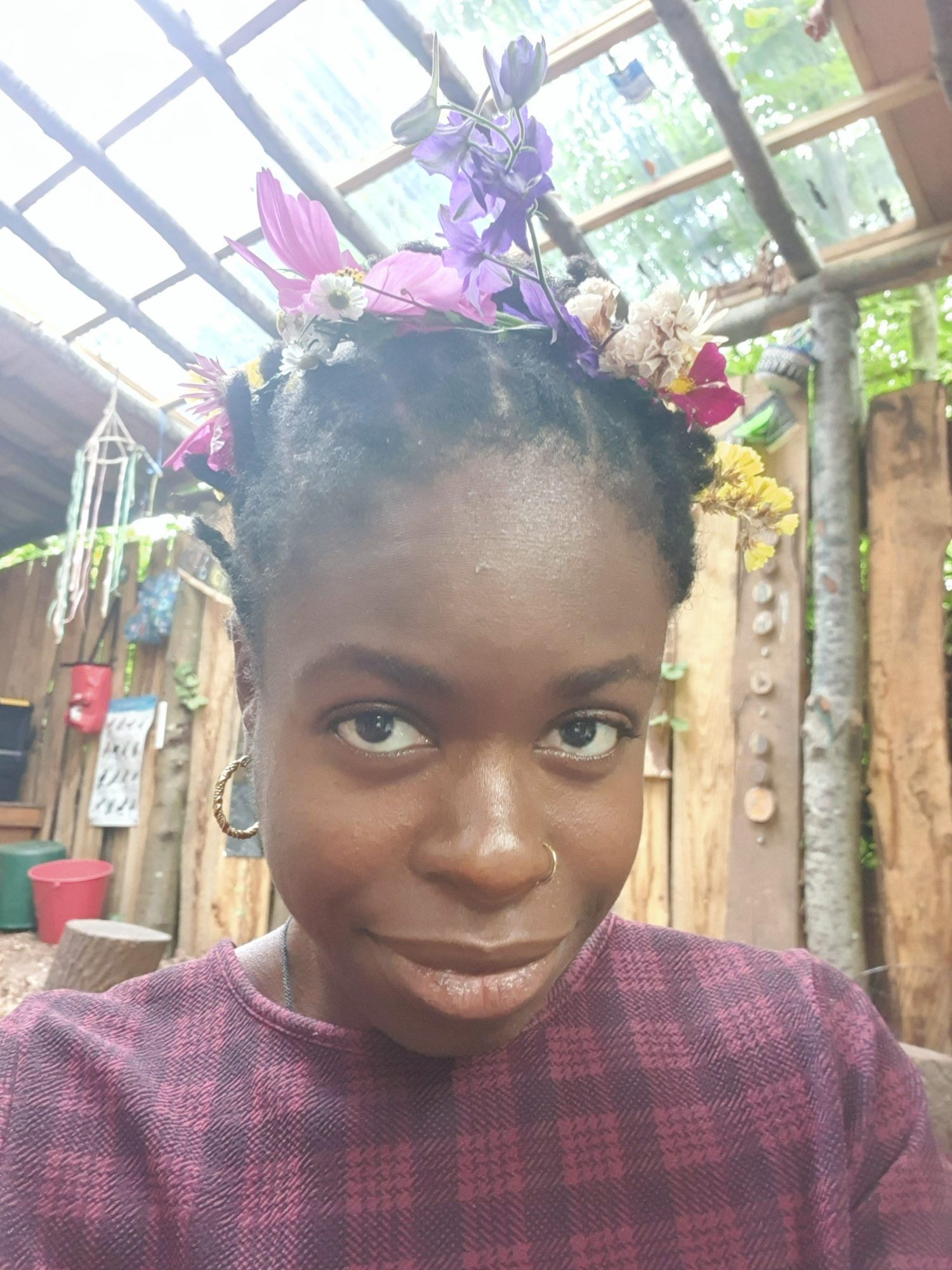 A selfie of Ashley with flowers in her hair.