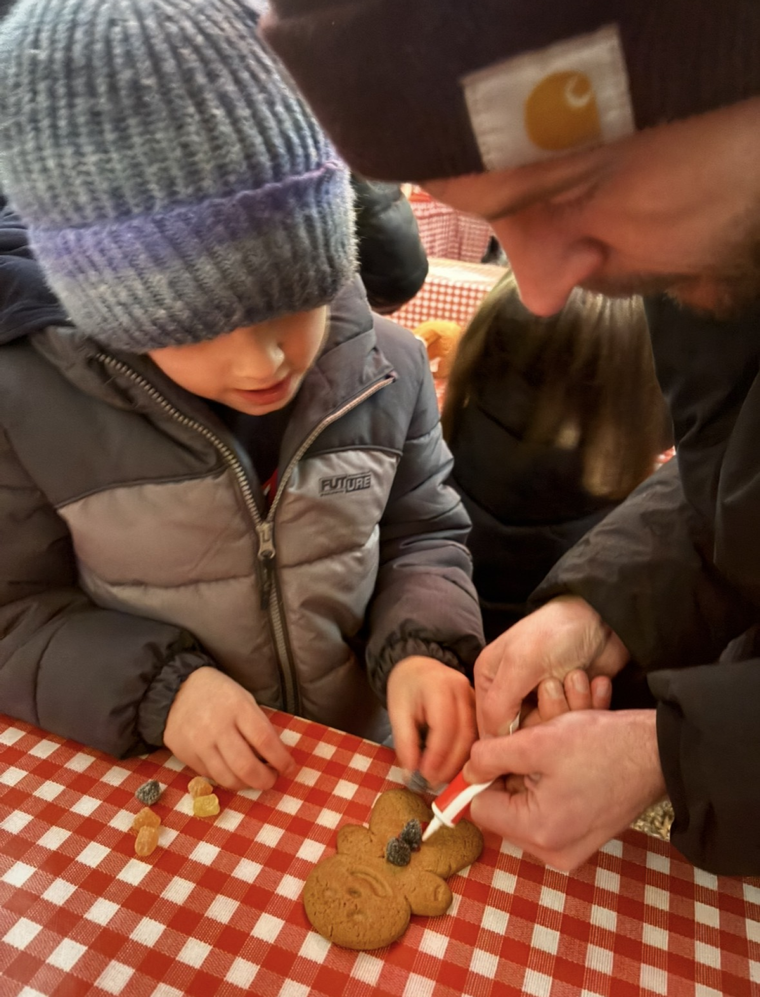 George and his son decorate a gingerbread person.