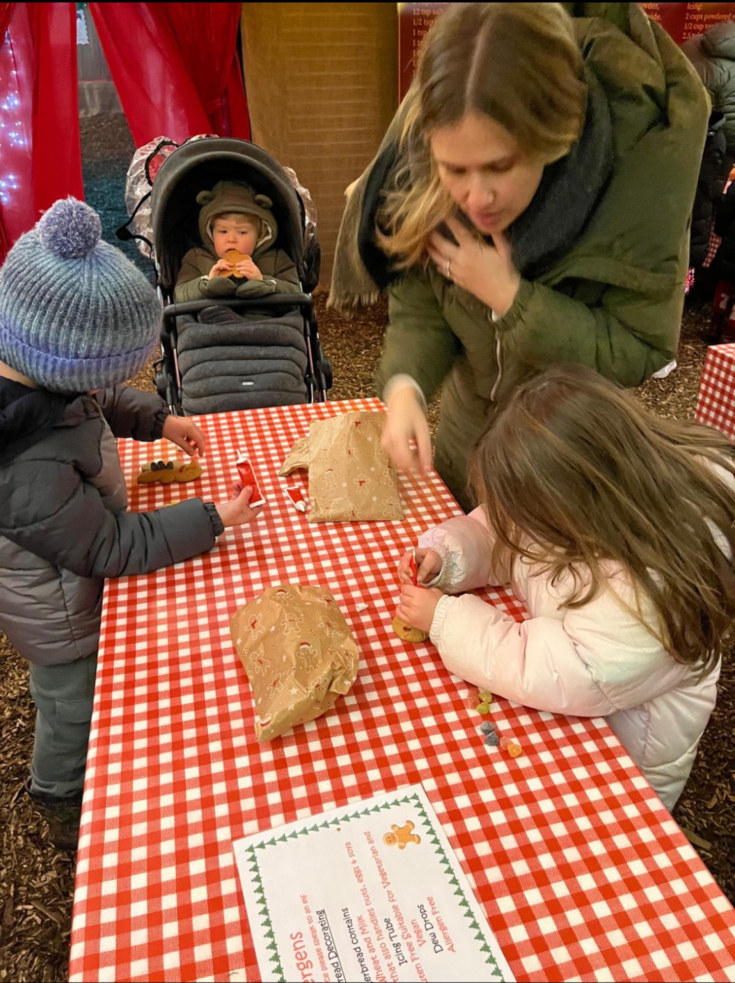 Harriet and her children decorate gingerbread people.